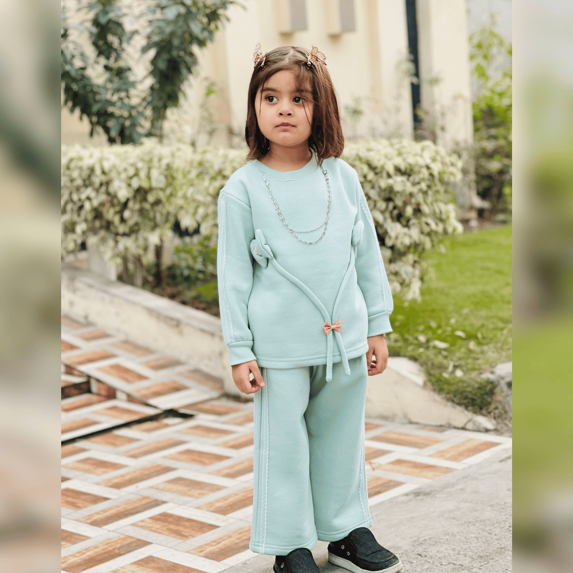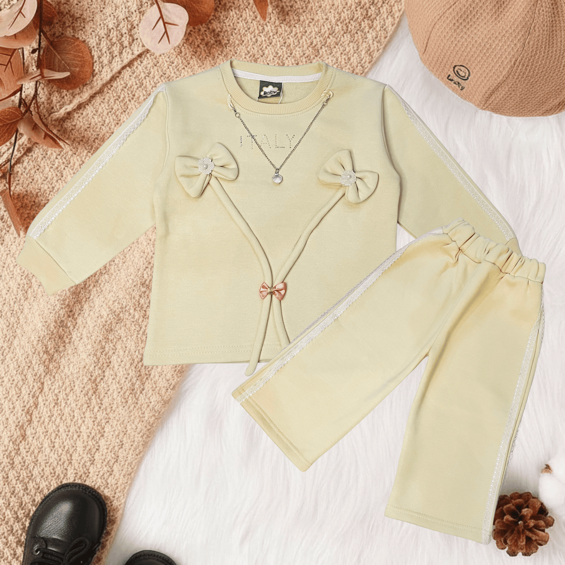 Designer Baby Girl Outfit with Bow & Decorative Chain Detail – MA16